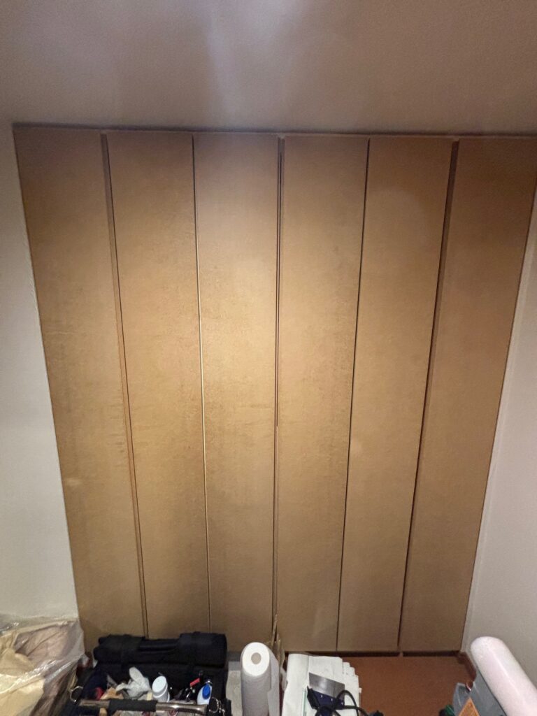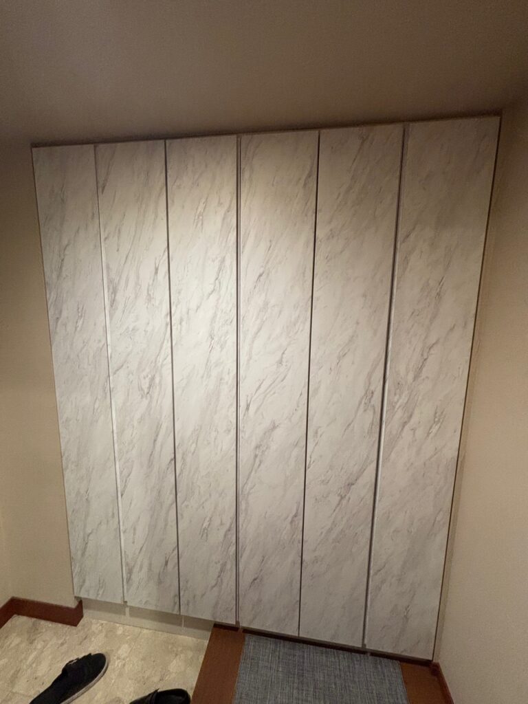 こんにちは。今回は、世田谷区のお客様よりご依頼を頂きリビング収納・シューズクローク・洗面収納に大理石調のダイノックシートを施工してまいりました。施工前の写真を忘れてしまったのですが、施工前は既存のシートがかなり浮いており部分はがしでの対応が厳しいと判断をし、全ての扉の既存シートを剥がしてからの施工となりました。施工前の写真が既存シートを剥がした後の写真ですが、施工前と施工後でお家の中の感じも素敵な空間へと変わりました。施工日数は2日間です。